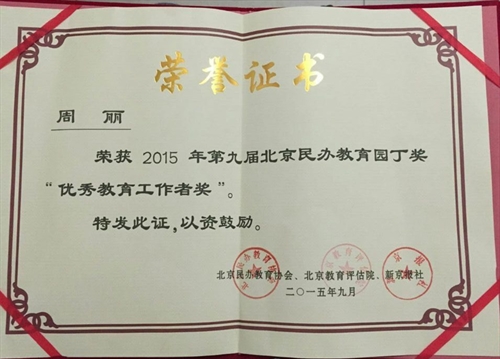 2015年9月10日,正值第31个教师节,由北京市民办教育协会、北京教育评估院和新京报社共同主办的“2015第九届北京民办教育园丁奖”评选颁奖典礼在北京教育考试院举行。